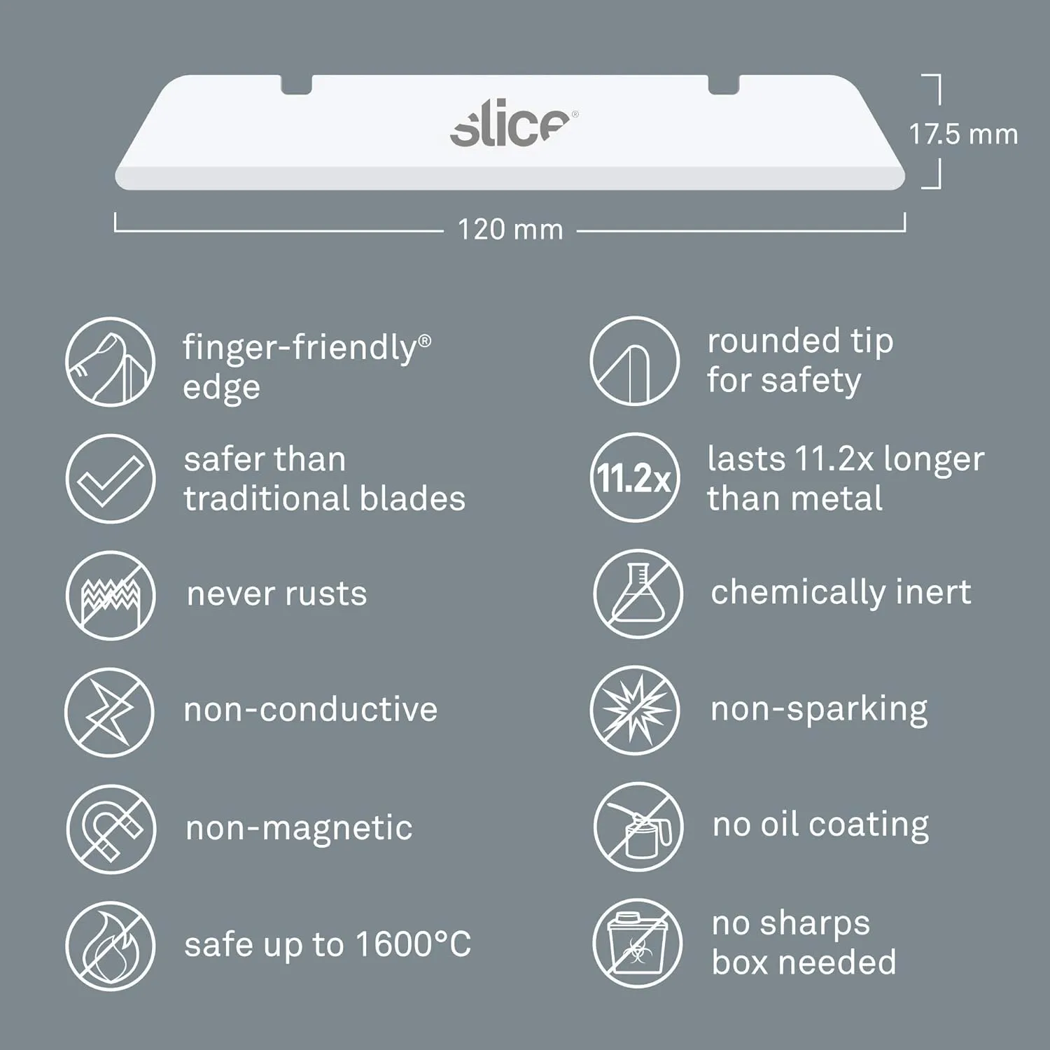 Unlike traditional steel blades, Slice blades are made from 100% zirconium oxide, a high-tech ceramic material that is harder than steel, chemically inert, non-conductive, and rust-proof. They remain sharp up to 11x longer than metal blades while offering Slice’s signature finger-friendly® edge that cuts effectively but is safe to touch.